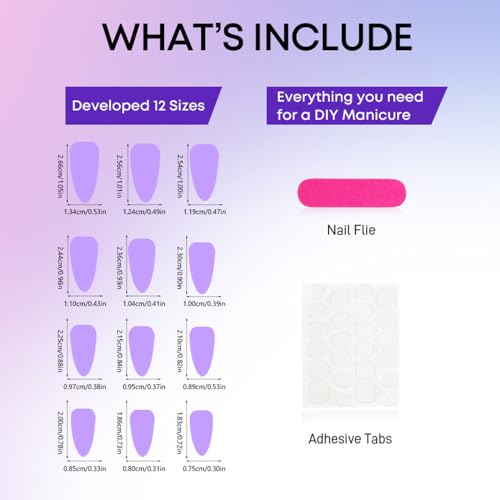 【What You Will Get】:A box contains 24 fake nails, a nail file and 24 jelly glues,an orange wood stick, a set of cleaning cotton,the fake nails are divided into 12 different sizes.The soft elastic and seamless cuticle line conforms perfectly to the nail bed.Nail art stickers in various sizes, convenient for you to choose the nail tips that suits your nails.