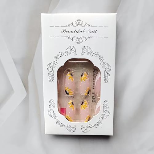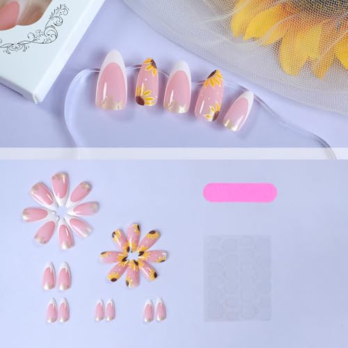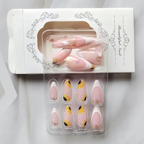 24 Pcs Pink Press on Nails Short Almond – SHANRUN Summer Fake Nails Press ons White French Nail Art Tips Glue on Nails Stick on Nails Full Cover Artificial Acrylic False Nails with Sunflowers Design