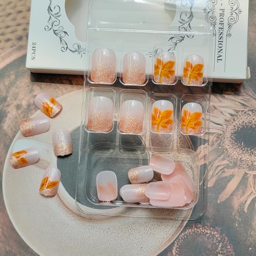 24Pcs Fall Fake Nails Glitter French Tip Press on Nails Short Maple Leaf False Nails Autumn Stick on Nails Maple Leaves Acrylic Artificial Nails for Women Girls Thanksgiving Glue on Nails Decoration