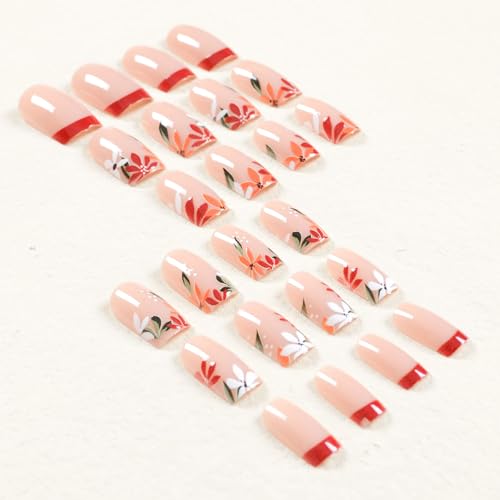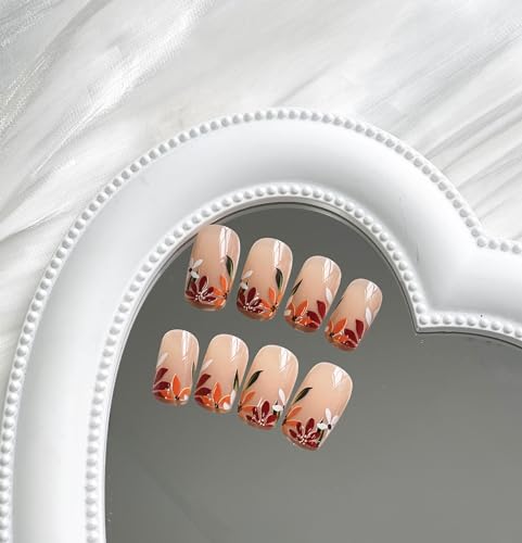 Fall Press on Nails Medium Square MABKJLF French Tip Fake Nails Wine Red Full Cover Flower Nail Tip False Nails with Designs Glossy Glue on Nails Manicure Artificial Nails for Women Girls 24Pcs