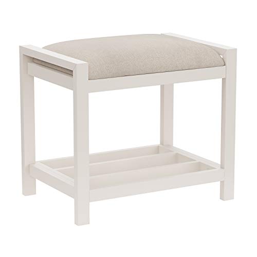 You’ve got to be feeling the casual vibes with this Upholstered Vanity Stool. You’ll add transitional charm to your vanity set, bathroom, or wherever an accent stool is needed. The white solid wood frame provides a clean and casual look, offset by gently textured, light beige linen fabric. Steal some extra storage with the mission-style shelf that fits baskets or stacked items. Whether you use it to rest your backside or prop up your tired feet, the firm, upholstered vanity seat offers trustworthy support. Assembly required.