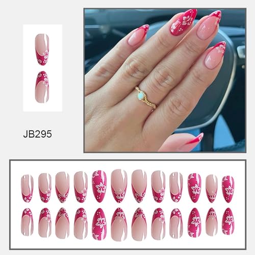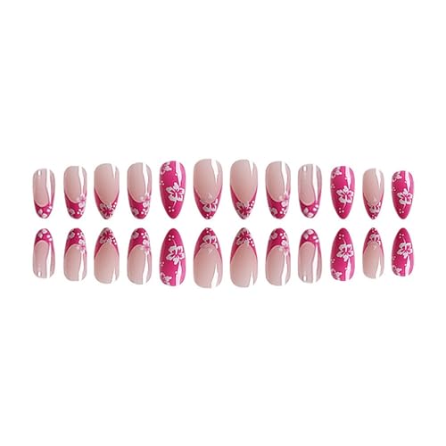 Pink Press on Nails Almond Fake Nails with White Flower Designs Stick on Nails Full Cover Glossy French Tip Acrylic Nails False Nails Gel Glue on Nails for Women Girls Summer Holiday Manicure 24pcs